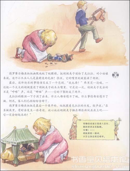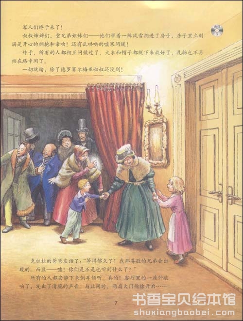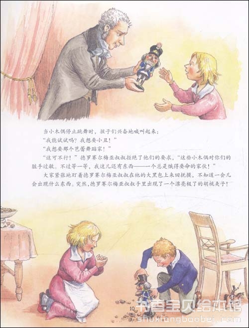 弗里茨和克拉拉迫切地期待着平安夜的家庭聚会。德罗赛尔梅亚叔叔很晚才出现,不过他带来了令孩子们着迷的礼物。他送给他最喜欢的克拉拉一件特别的礼物:一个胡桃夹子。克拉拉开心极了!可不幸的是,胡桃夹子的下颚突然断成了两半……