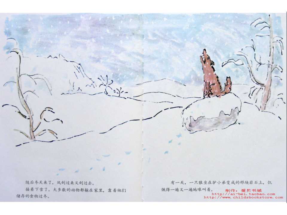 有一天,一只狼坐在驴小弟变成的那块岩石上,饥饿得一遍又一遍地嗥叫着。