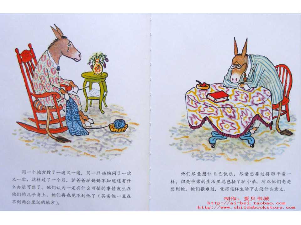 同一个地方搜了一遍又一遍,同一只动物问了一次又一次,这样过了一个月,驴爸爸和驴妈妈不知道还有什么办法可想了。他们认为一定有什么可怕的事情发生在他们儿子身上,他们再也见不到他了(其实他一直在不到两公里远的地方)。