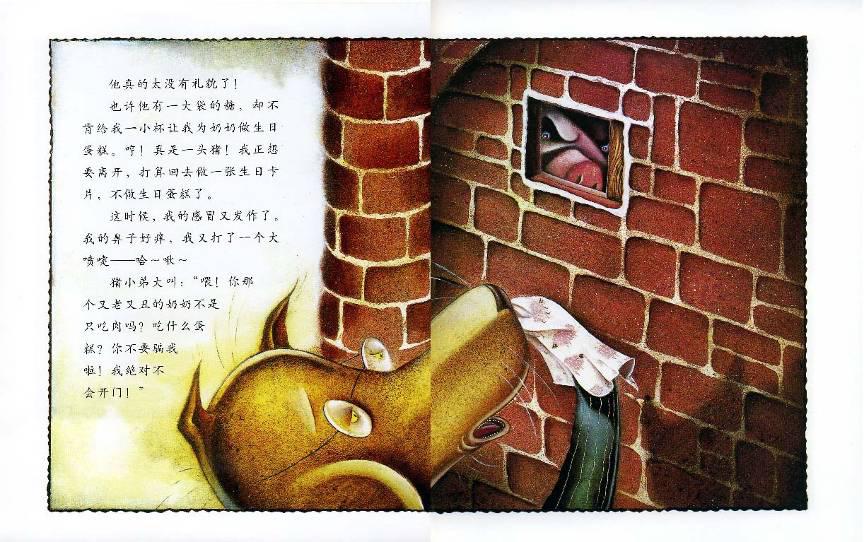 猪小弟大叫“喂!你那个又老又丑的奶奶不是只吃肉吗?吃什么蛋糕?你不要骗我啦!我绝对不会开门!”