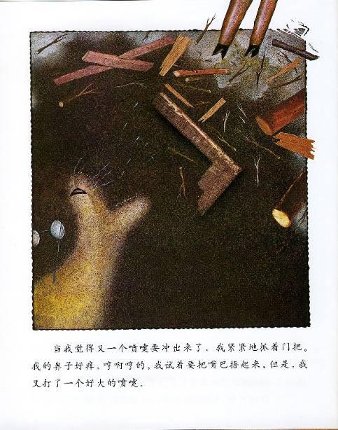 当我觉得又一个喷嚏要冲出来了,我紧紧地抓着门把。我的鼻子很痒,哼啊哼的,我试着把嘴巴捂起来,但是,我又打了一个好大的喷嚏。