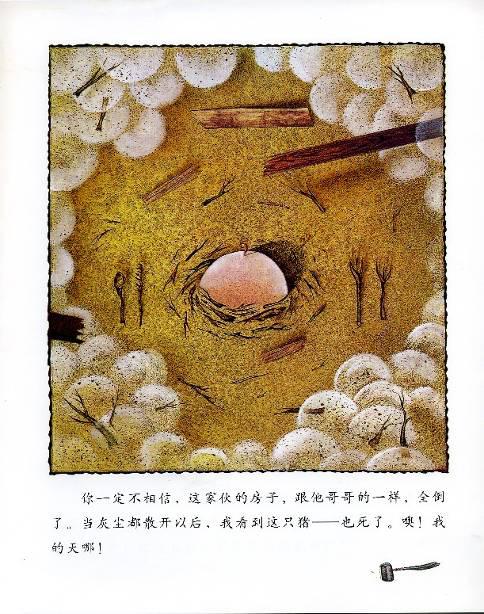 你一定不相信,这家伙的房子,跟他哥哥的一样,全倒了。当灰尘散开后,我看到这只猪——也死了。噢!我的天哪!
