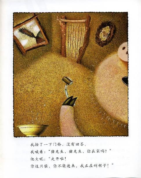 我敲一敲门,没有回答,我喊着:“猪先生,猪先生,你在家吗?”你知道那只粗鲁的小猪是怎么回答的吗?“走开!你这只狼,不要再来烦我啦!”