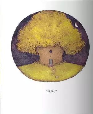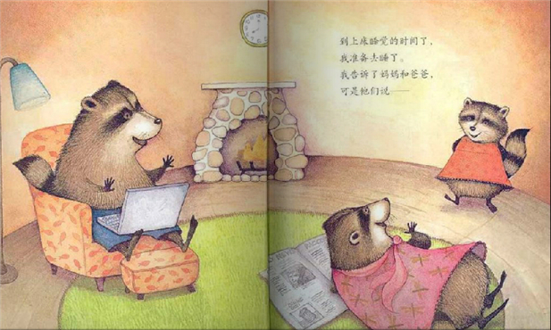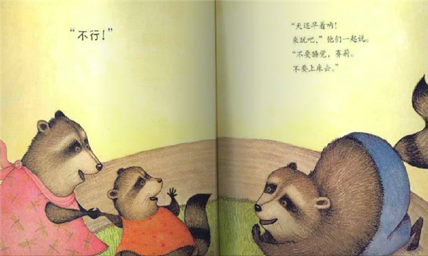 翻开书,淡紫色的扉页仿佛是静谧的夜幕,画家通过色彩的运用巧妙地将读者带进了这本图画书发生的特定时间——夜晚。全书用水彩作为基本画材,紫色和黄色作为基本用色,透明的水彩叠加产生出微妙的色层变化。尤其是黄色和紫色互为补色,两种颜色在同一画面中相互衬托,黄色显得耀眼活泼,紫色则沉着冷静,两色叠加后形成透明的棕灰色,很适合表现影子。根据这样的色彩属性,画家在室内多用温馨的黄色,室外的色彩处理则多偏紫,也符合夜晚沉静的特点。色彩的对比一如故事中角色性格的对比:一到晚间就精神十足的浣熊父母与性情温和沉静的小浣熊,恰好同黄色、紫色的色彩属性保持一致。