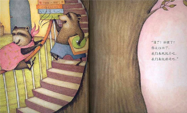 大胆的构图是这本图画书的另一特色。浣熊居住在树洞中,画家就将大树横断面形成的圆形作为构图的要素,几乎每个跨页都能看到圆形或弧形在进行着分割:圆形的地毯、窗户、时钟、糕点、墙壁上的装饰画,甚至家门口的石阶;环形盘旋上升的楼梯,弧形的房门……