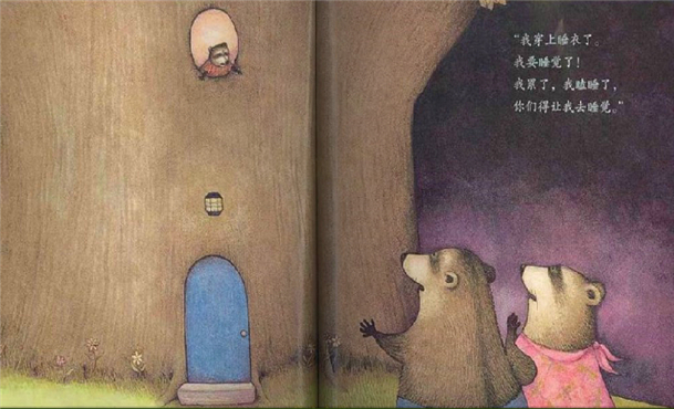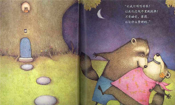 曲线肆意分割着画面,画家由此创造出一个树洞里的小世界,不安定的圆形与浣熊父母好动的习性还真配。故事在小浣熊忍无可忍从床上跳起发生转折,最终迎来了一个宁静的夜晚。最后一页上是浣熊家的大树房子,看上去多么恬静,连月亮也像依偎着树梢睡着了一般。