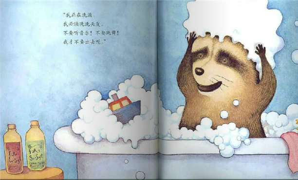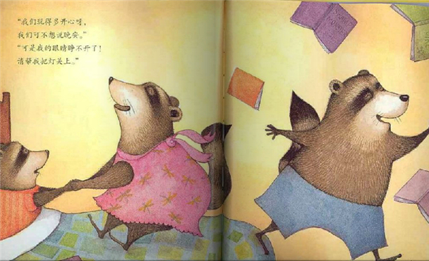 画家遵从自然但又不是将自然生硬地搬到图画书中,比如浣熊从外形上难分性别,画家就将它们进行拟人化处理,穿裙子的是女性的角色,穿裤子的则是男性的角色,这样在故事中就很容易表现出不同角色的性格特征,读图时也不会产生歧义了。