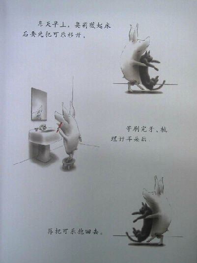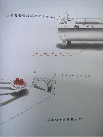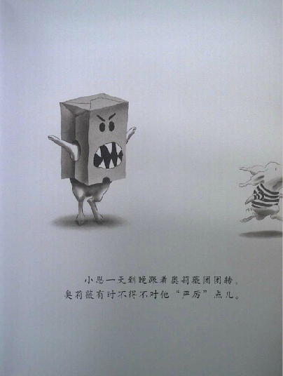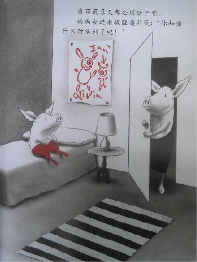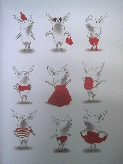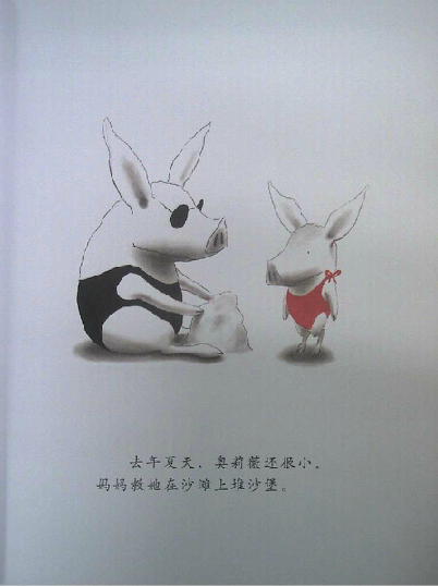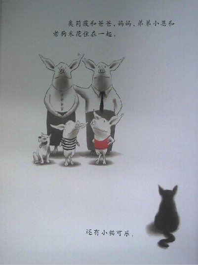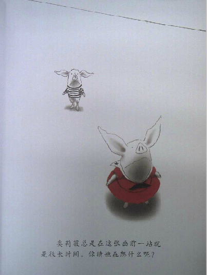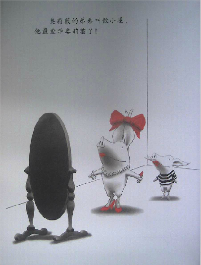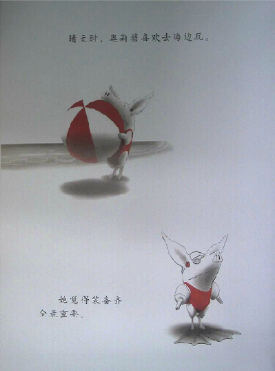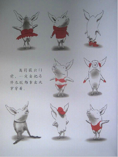 读过《奥莉薇》的爸爸妈妈们,很容易有这样的同感:奥莉薇就是自家的小宝贝!封面一开始,我们看到了奥莉薇的全身正面形象,接着翻下去,奥莉薇的各种衣饰、装备展现在眼前,还有她的各种表情、动作,接着是她的家人。我们感觉奥莉薇已经变得越来越熟悉,形象也越来越丰满,可是回头想想,伊恩除了这些,别的几乎什么也没画。他甚至只用了黑、白、红三种颜色就完成了这一切。就这样,画家不可思议地将所有人的关注聚焦于小奥莉薇身上,我们完全不必操心故事发生在何时、何地,而这,也使得孩子更自然地联想到自身。