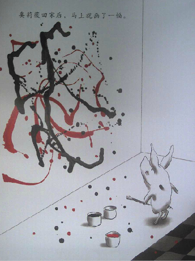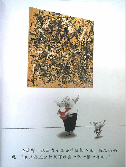 她会涂妈妈的口红、穿上妈妈的高跟鞋照镜子,还会吓弟弟。要是出门,她还会把所有的衣服都拿出来穿一遍。晴天妈妈会带她去海边,她会把自己晒成一条大热狗;而下雨天,她则会去参观博物馆。她喜欢直直走到埃德加•德加的《芭蕾排演》面前,那是她最喜欢的一幅画,她幻想自己有一天也能成为一名芭蕾舞演员。不过有一张画她老是搞不懂,就是杰克逊•波拉克的《秋天的韵律30号》,她对妈妈说,这样的画,我大概只要五分钟,就可以画一幅一模一样的。回到家里,她就真的在墙上画了起来……