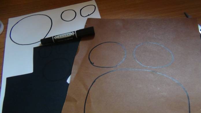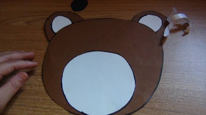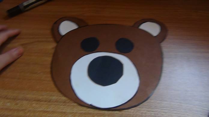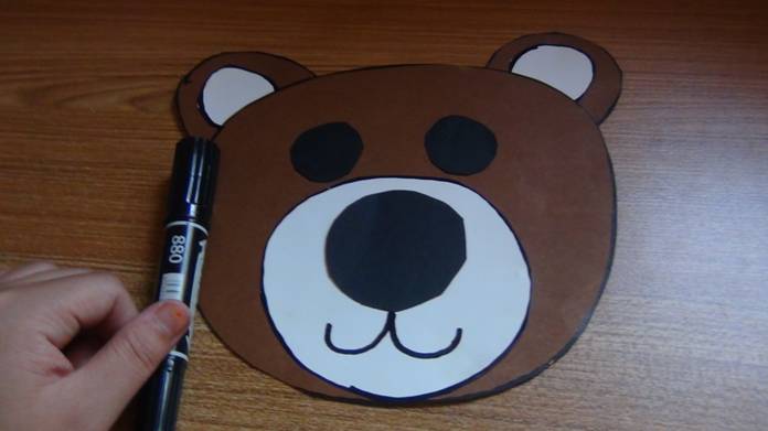 在棕色卡纸上画出熊圆圆的头和圆圆的耳朵,在白色卡纸上画出圆形的熊嘴巴和两个熊的内耳,在黑色的卡纸上画出熊圆圆的大鼻子和两个圆形的眼睛。