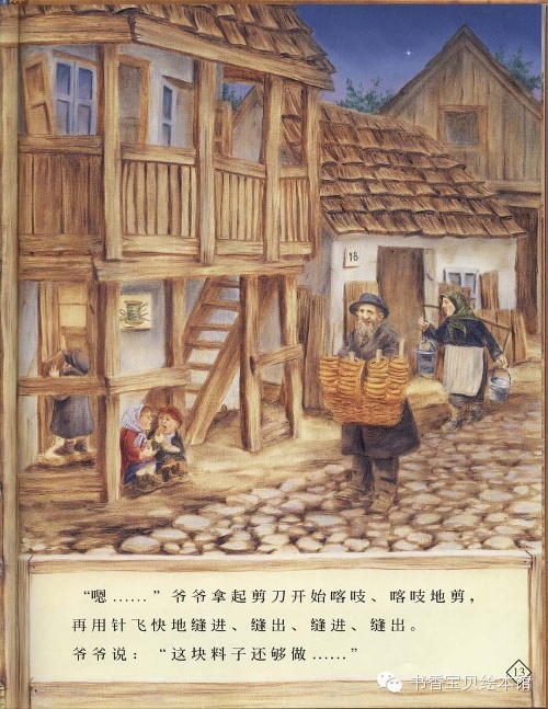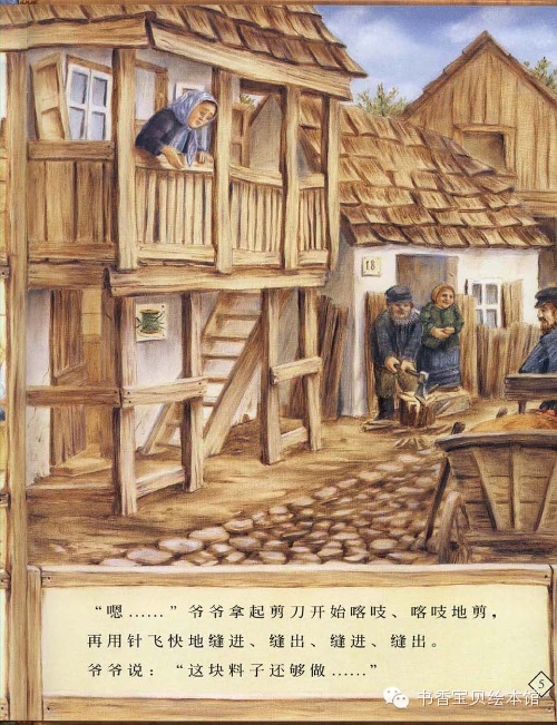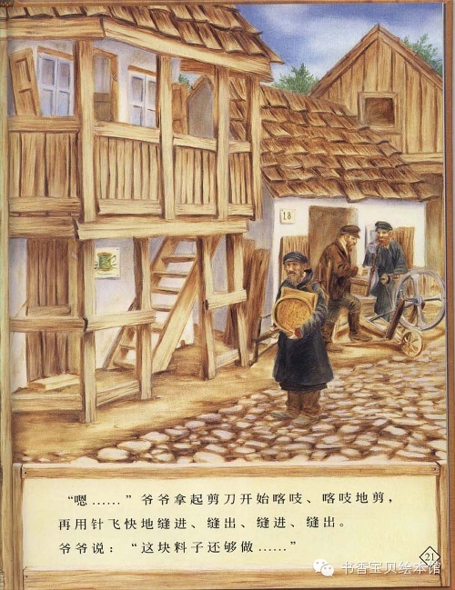 “嗯……”爷爷拿起剪刀开始喀吱、喀吱地剪,再用针飞快地缝进、缝出、缝进、缝出。爷爷说:“这块料子还够做……”
