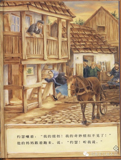 约瑟嚷着:“我的纽扣!我的奇妙纽扣不见了!”他的妈妈跟着跑来,说:“约瑟!听我说。”