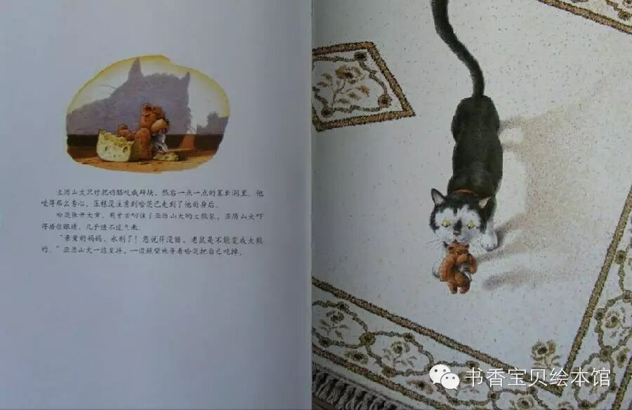 一连几天,每当哈茨妈妈睡着的时候,亚力山大就把美味的食物运回地板下的家里。有时他还会在家里多待一会儿,和老鼠兄弟姐妹们分享图画书中的故事。