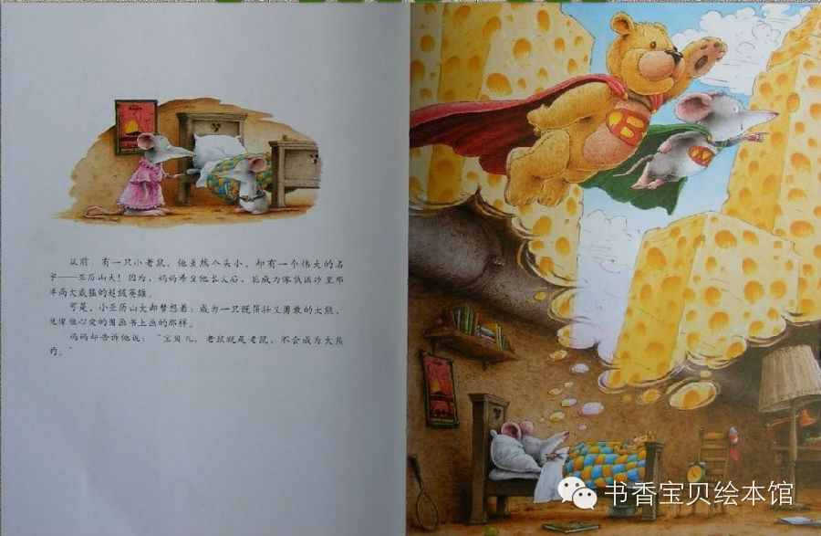 第二天早上,老鼠一家发现了那堆奶酪。他们高兴极了,狼吞虎咽地把奶酪吃了个精光。妈妈心满意足地看着孩子们,突然发现亚力山大不见了。她惊慌地跳了起来,却被亚力山大那本关于大熊的图书绊了一下。她也看到了地上的那堆毛皮大衣的碎片。她这才想起亚力山大的梦想。