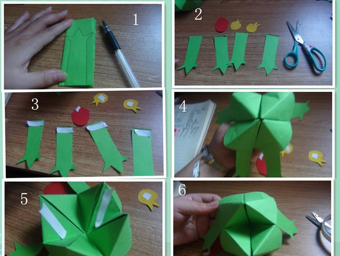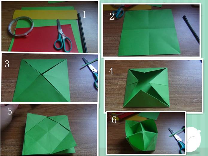 找出正方形的折纸,四角向中间折,翻过来,四角在向中间折叠。翻过来,四个直角向外拉开,翻过来,四个角向外突出。操作过程请详细观察图画