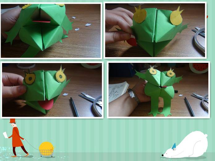 师:快看小青蛙是怎么出来的?小木偶看到小青蛙出来,他心里会想什么呢?