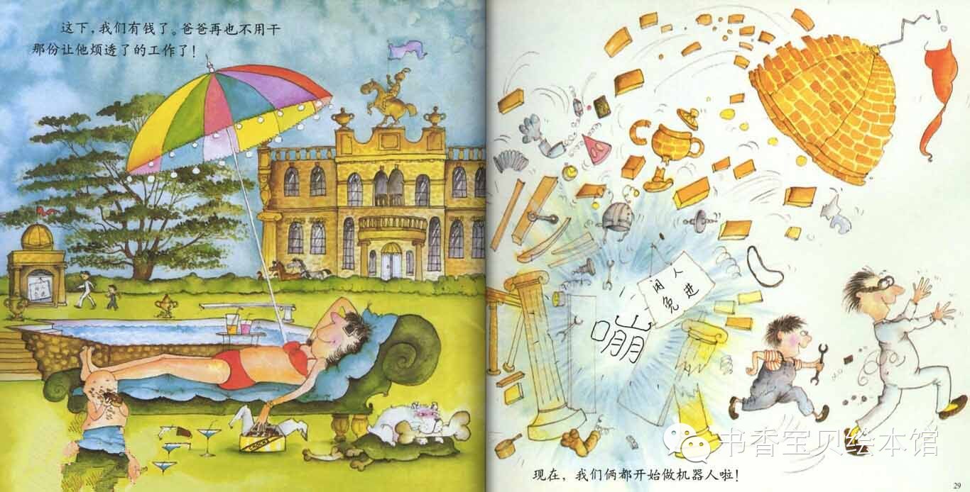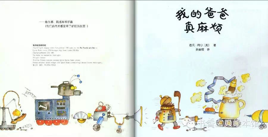 ——尽管创造的过程中仍然免不了失败,免不了爆炸之类的麻烦,但是,麻烦中孕育着希望,麻烦中孕育着快乐。从这个意义来看,书名《我的爸爸真麻烦》,其实正是对爸爸创造精神的褒奖,只不过作者运用了一种幽默调侃的语气罢了,否则,她为什么要把这本图画书送给爸爸会发明好玩东西的乔娜、凯洛琳和罗森呢?
