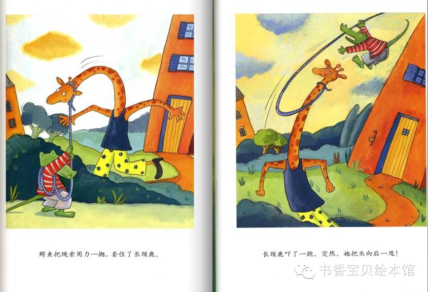 ”鳄鱼把绳索用力一抛,套住了长颈鹿。长颈鹿吓了一跳,突然,她把头向后一甩!