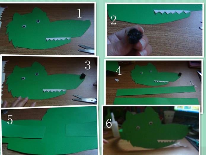 画出小绿狼的外形,剪下来,画出牙齿线,把白色卡纸比在牙齿线上画出锯齿线。剪下来,在活动的眼珠上面涂上胶。