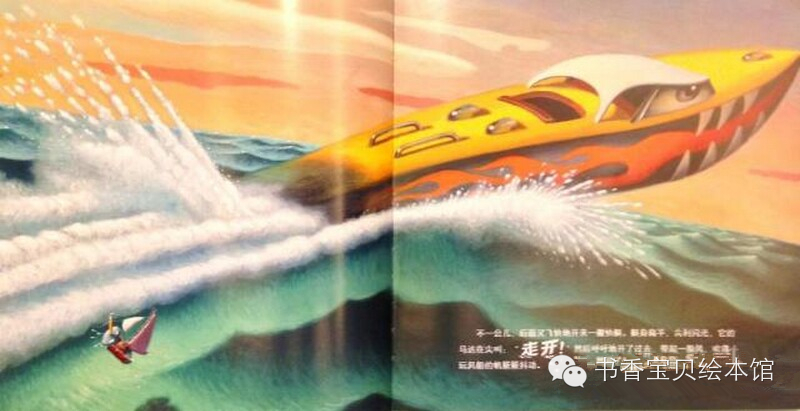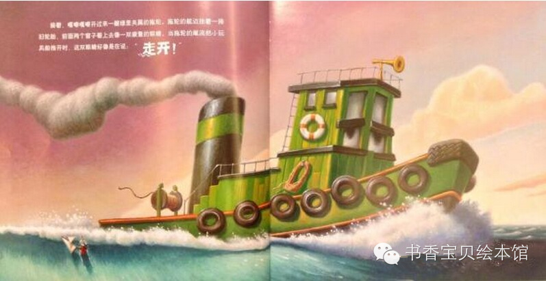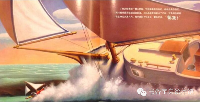 小玩具船靠近一艘大帆船,它的船身是白色的,船帆也是白色的,两只船并排冲过滔滔的巨浪,小玩具船觉得有点了不起,可是那白帆船在它旁边又高又大,把水溅到了它身上,警告它说:“(Go away!)走开!”