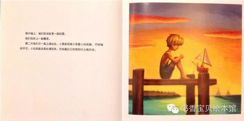 那天晚上,他们在浴缸里一起玩耍。他们在床上一起睡觉。第二天,他们又一起上湖边去,小男孩用绳子牵着小玩具船,不时地放开它,小玩具船总是会漂回来。它知道自己想要到什么地方去。