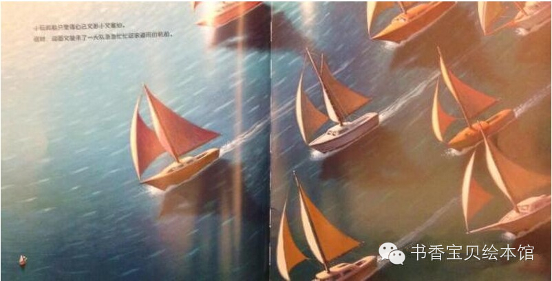 小玩具船只觉得自己又渺小又害怕。这时,迎面又来了一大队急急忙忙回家避雨的帆船。