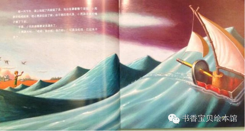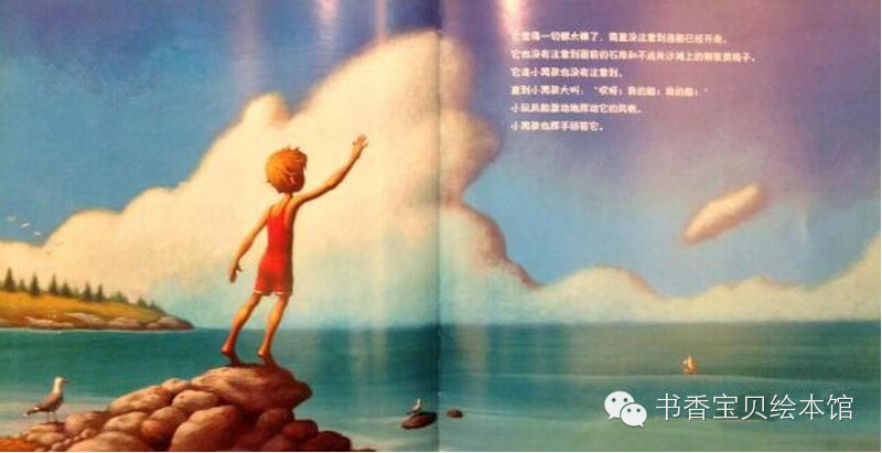它觉得一切都太棒了,简直没注意到渔船已经走开。它也没有注意到面前的石岸和不远处沙滩上的那张黄椅子。它连小男孩也没有注意到。直到小男孩大叫“哎呀,我的船,我的船!”小玩具船激动地挥动风帆,小男孩也挥手回答它。