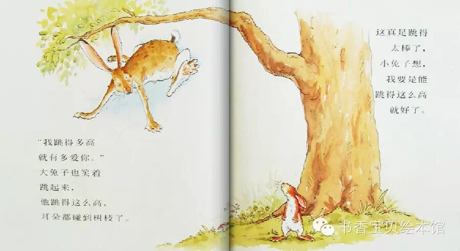大兔子笑著说:可是,我爱你,像我跳的这么高,高得不能再高。他往上一跳,耳朵都跳到树枝了。