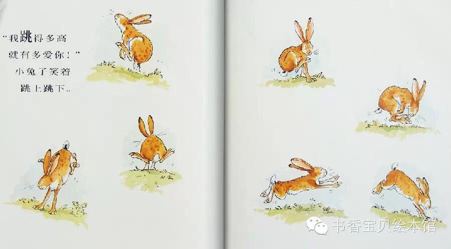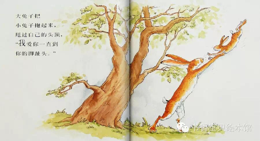大兔子把小兔子抛起来,飞得比他的头还高,说:我爱你到你的脚趾头那么多。
