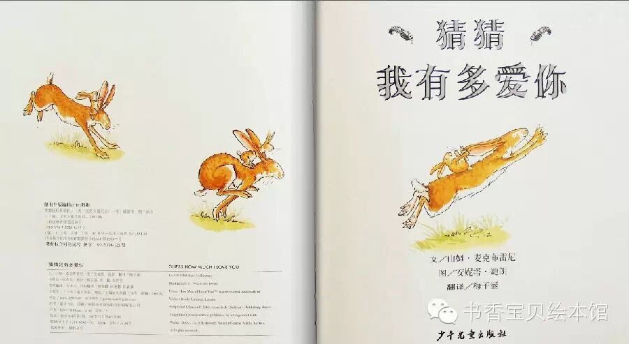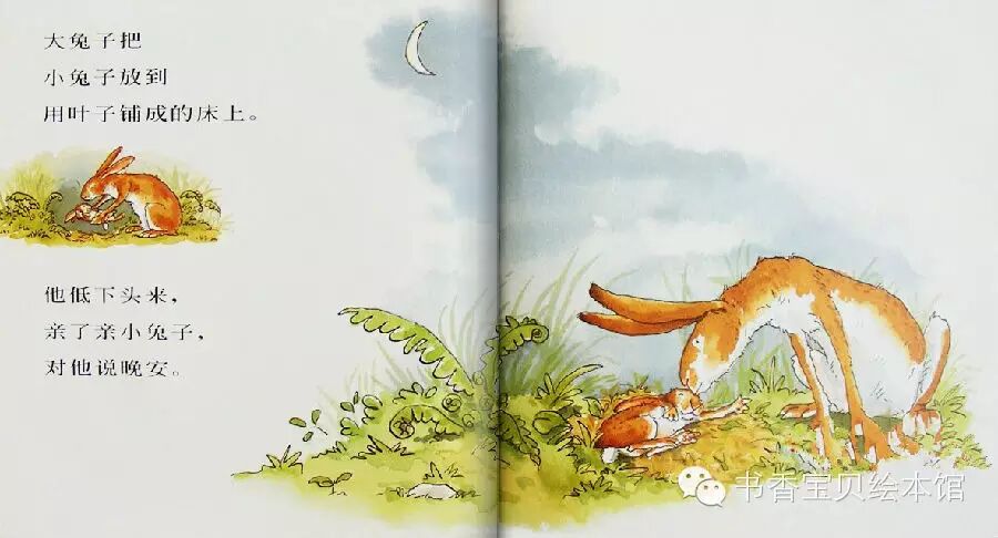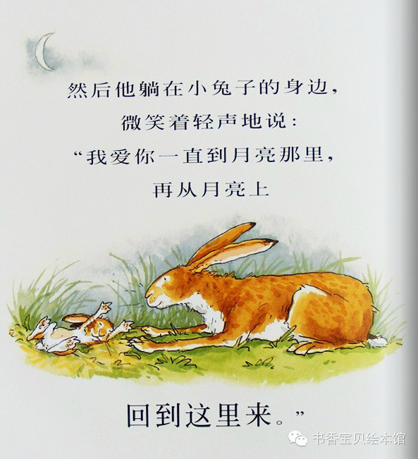 然后,大兔子躺在小兔子的旁边,小声的微笑著说:我爱你从这里一直到月亮,再──绕回来。