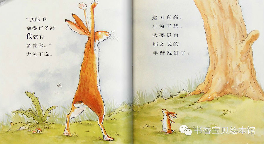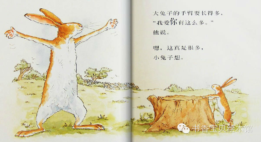 大兔子有一双更长的手臂,他张开来一比,说:可是,我爱你这么多。小兔子想:嗯,这真的很多。