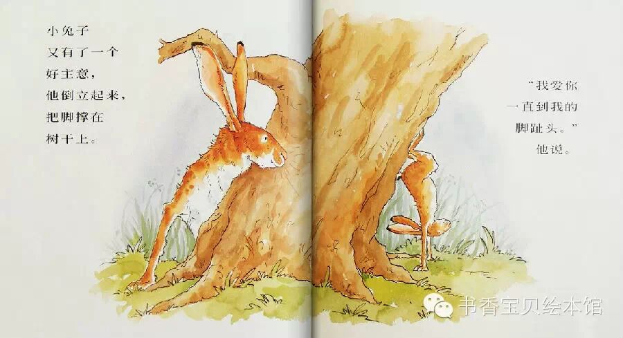 小兔子又有一个好主意。他把脚顶在树干上,倒立起来了。他说:我爱你到我的脚趾头这么多。