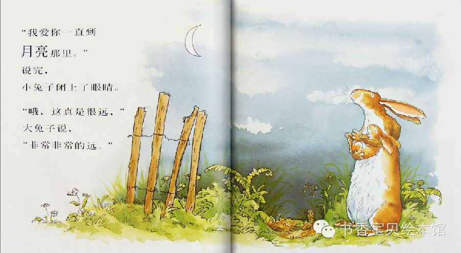 小兔子闭上了眼睛说:我爱你,从这里一直到月亮。 噢!那么远,大兔子说,真的非常远、非常远。