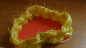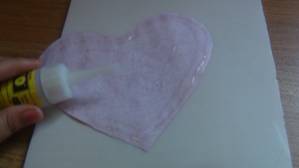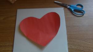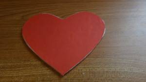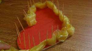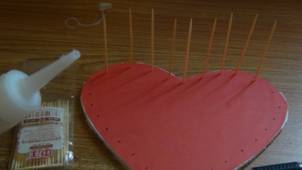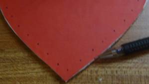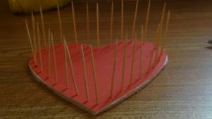 1把心形剪下来,涂上胶水粘贴到板子上,把板子用刀也画成心形,先用笔画出扎孔的位置,并用牙签扎出小孔如下图。