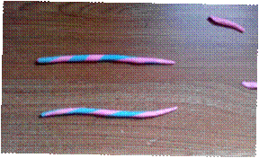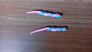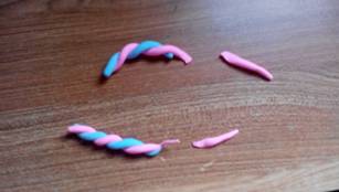 平均分成两份,搓成长条,蓝色和粉色扭成麻花形状。