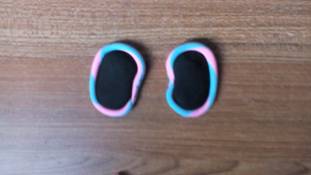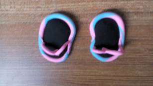 用手掌轻轻压平,成鞋底。之后取出蓝色和粉色的太空泥。