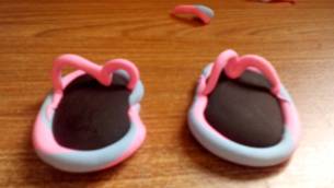 最后取出粉色的太空泥搓成长条,变成M形,按到鞋底上,一双小拖鞋就做好了!