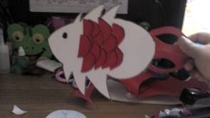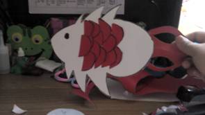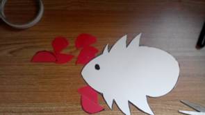 在红色卡纸上画出鱼鳞线,在白色卡纸上画出鱼的外形和眼睛并剪下来