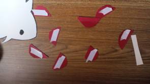 把剪下来的红色鱼鳞背面统一贴上双面胶,先贴后面再贴前面。