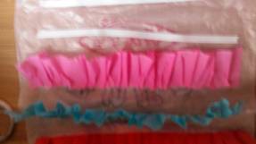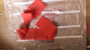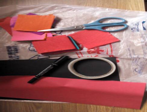 准备:1笔、剪刀、双面胶、若干皱纹纸、红色黑色卡纸还有一般的超市购物袋