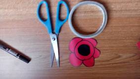 在红色卡纸上画出花朵,用剪刀剪下来,背面贴上双面胶。