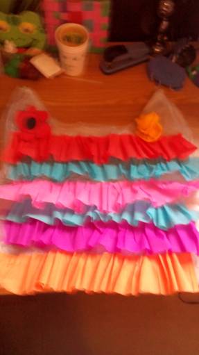 最后把剪好 的卡纸花和皱纹纸卷成的花朵贴到肩膀的位置上,这样袋子改装的一幅就做好了,还等什麽快试试吧!