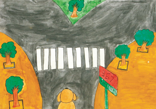 小狗狗打听到了回家的路后蹭电梯下了楼。看到路上车来车往的,可怎么过马路呢?他好害怕。