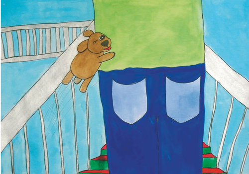 在天桥底下他看到了一个行人,这下有办法过马路了。他机敏的跳进了小朋友的裤兜里。