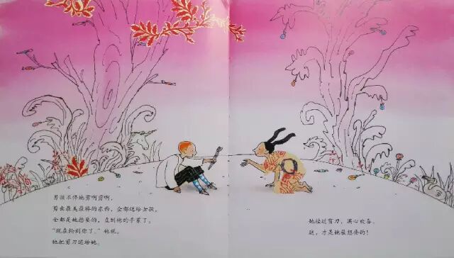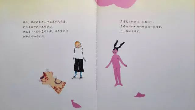 他取出一片粉红色的云彩,巧手剪不停,云彩变成一个女孩。
