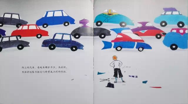 街上的汽车,看起来都差不多,真没劲,男孩拿起剪刀把它们修剪成不同的形状。