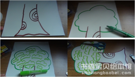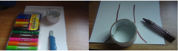 准备:一张白色卡纸、用完的胶带纸筒、小刀、彩笔、剪刀  把宽胶带平放到卡纸上,拿出棕色的彩笔画出树干的两条线。