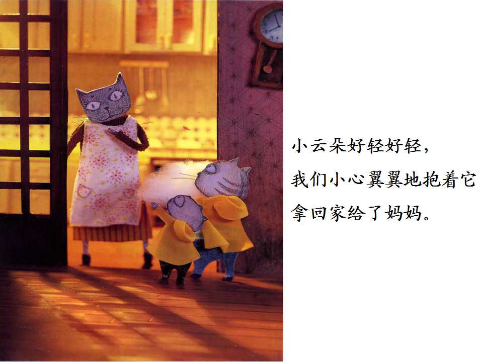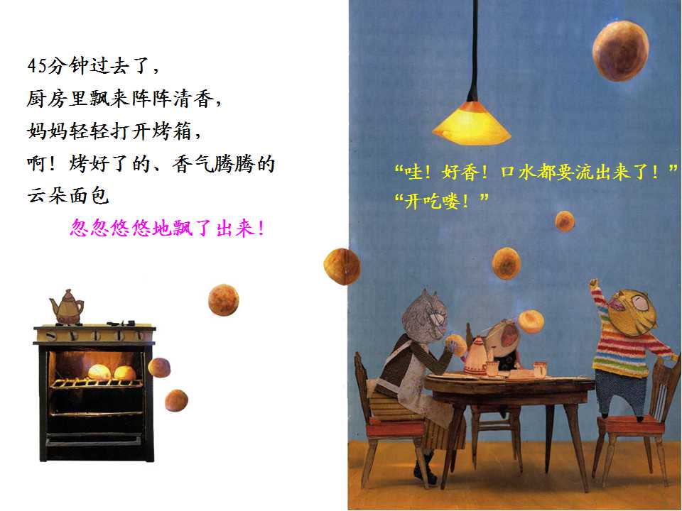 内容简介:下雨天的清晨,一片小云朵挂在了树枝上,孩子们非常好奇,小心翼翼地把云朵抱回了家。妈妈将云朵做成面包,吃了面包的他们竟然像云朵一样飘了起来!用云朵做的面包,像云朵一样浮起的故事,载着孩子的心进入奇妙的童话世界。而从孩子们给爸爸送早餐的故事中,我们更能感受到孩子们的爱心和孝心,在一阵淡淡的面包清香中,分享着这个家庭的温情与亲情。