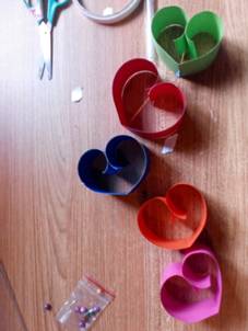 最后请小朋友把所有的心形做好串起来,心形风铃就做好了!感恩节,你是想送给妈妈还是爸爸呢?或者一起送。