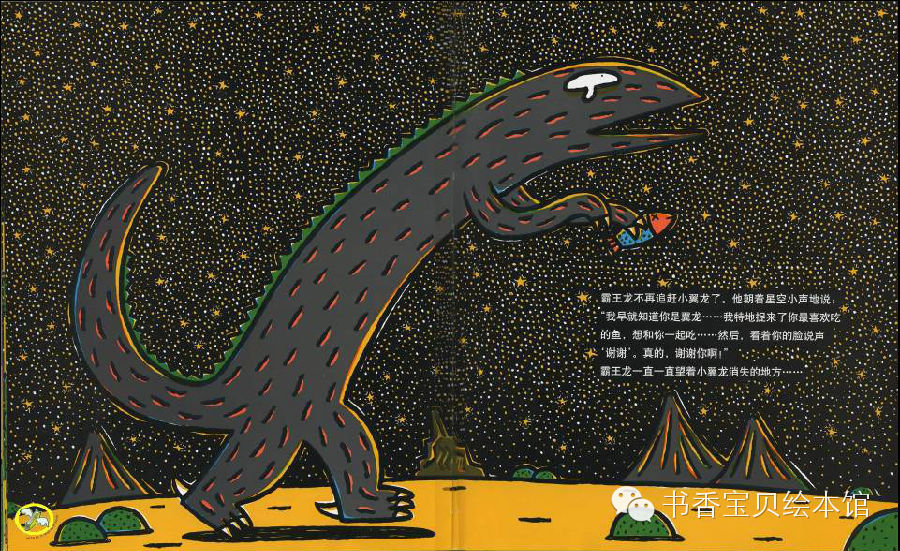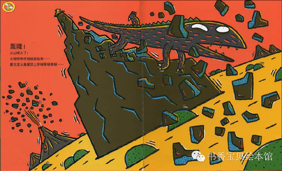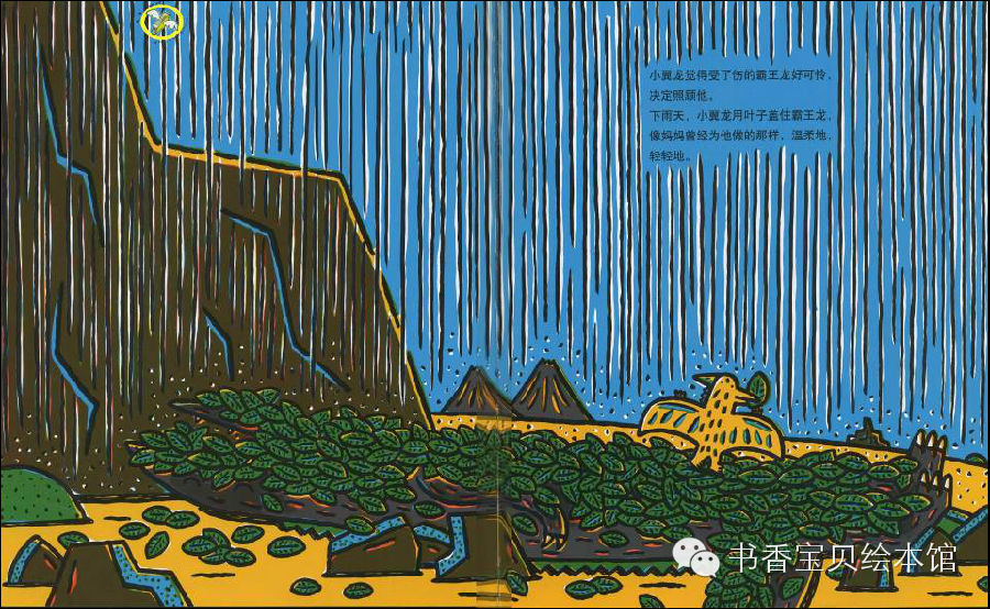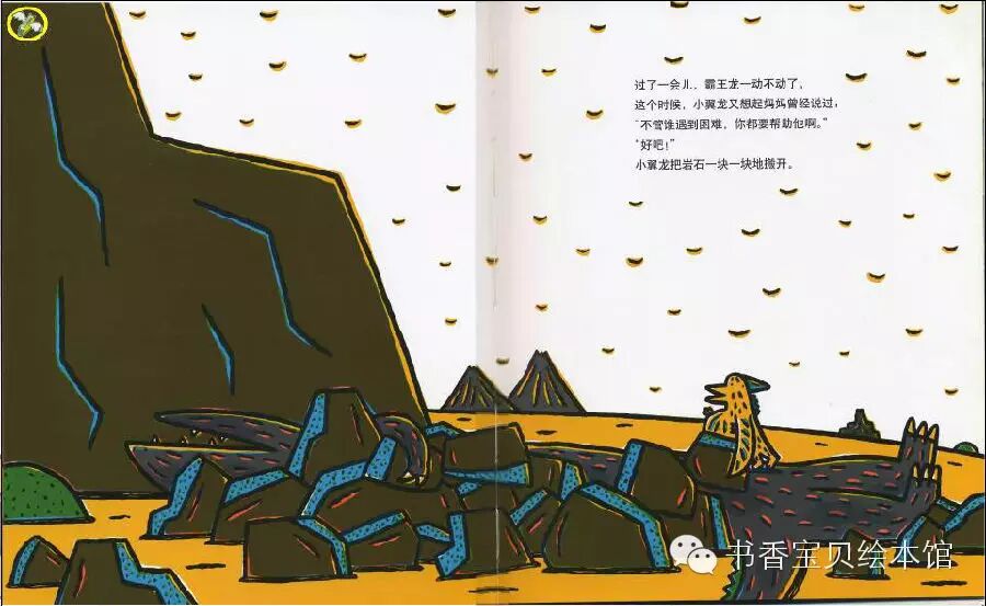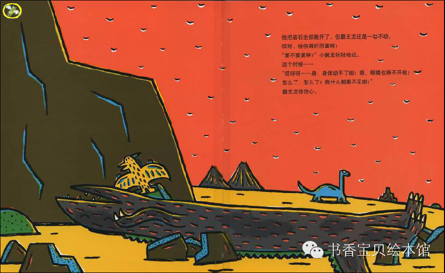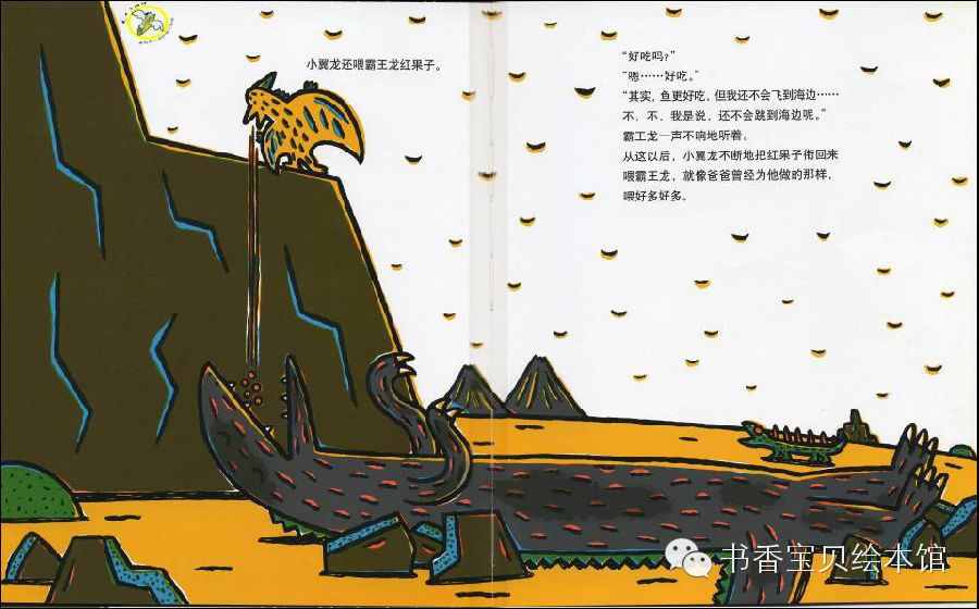 绘本内容:火山爆发后,小翼龙得救了,霸王龙却因此受伤,眼睛好像看不见了,躺在地上不能动了。小翼龙想起了妈妈教它的道理,开始照顾起霸王龙来。喂他吃果子喝水,就像爸爸妈妈照顾它那般。有一天,小翼龙摘果子回来,发现霸王龙站了起来,嘴里叼着鱼。它吓坏了,丢下果子就开始往天上飞,它心想:“如果我是霸王龙,就可以和你成为很好的朋友了。霸王龙,再见。”霸王龙在底下吼着:“你快回来,我一早就知道你是小翼龙了,我抓了你最喜欢的鱼,我们俩一起吃。”可惜小翼龙越飞越高了。